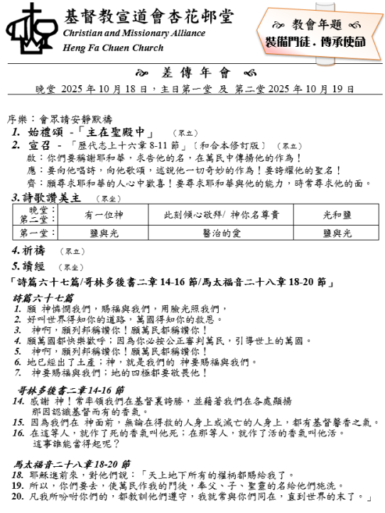 經文 - 「詩篇六十七篇/哥林多後書二章14-16節/馬太福音二十八章18-20節」
