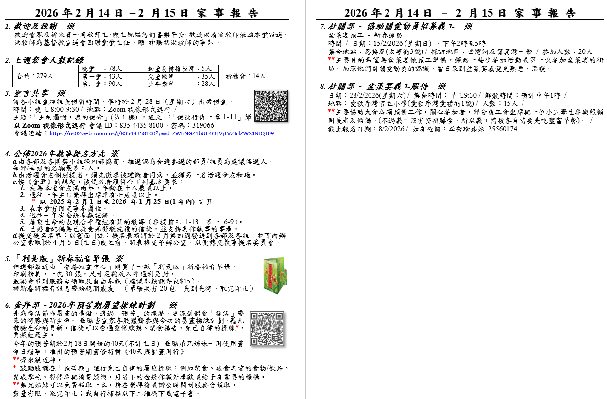 請各小組查經組長預留時間,準時於2月28日(星期六)出席預查。
