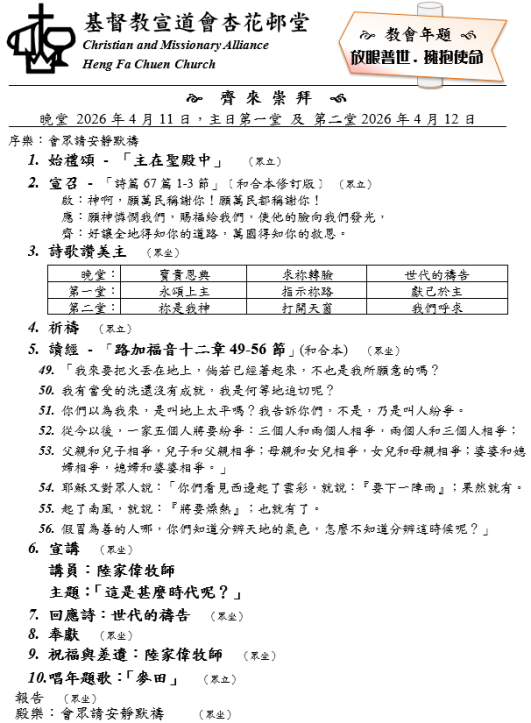 講員:陸家偉牧師 主題:「這是甚麼時代呢?陸家偉牧師這是甚麼時代呢?」 經文:「路加福音十二章49-56節」(和合本)
