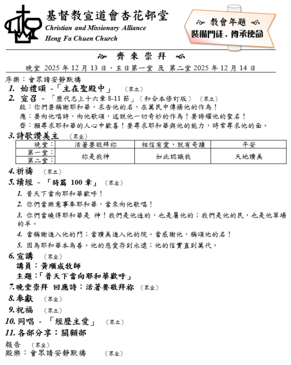 | 12/1/25 | 黃秀琴傳道 | 謙卑的心 | 約翰福音十三章31-38節(和修本) |